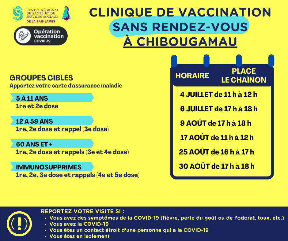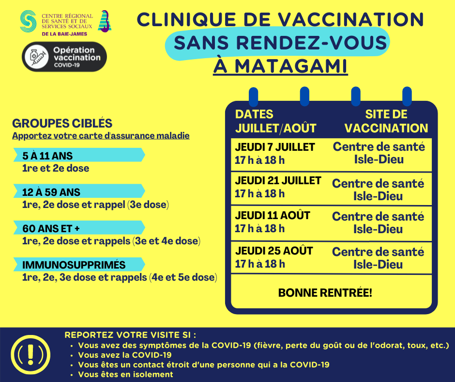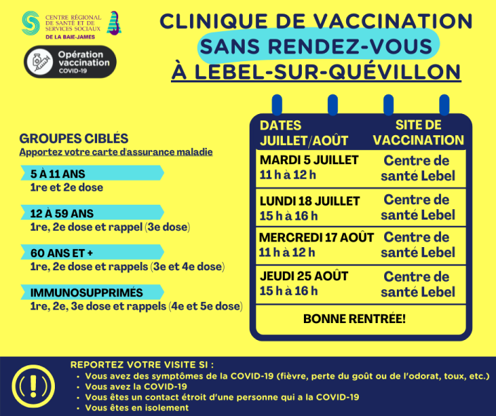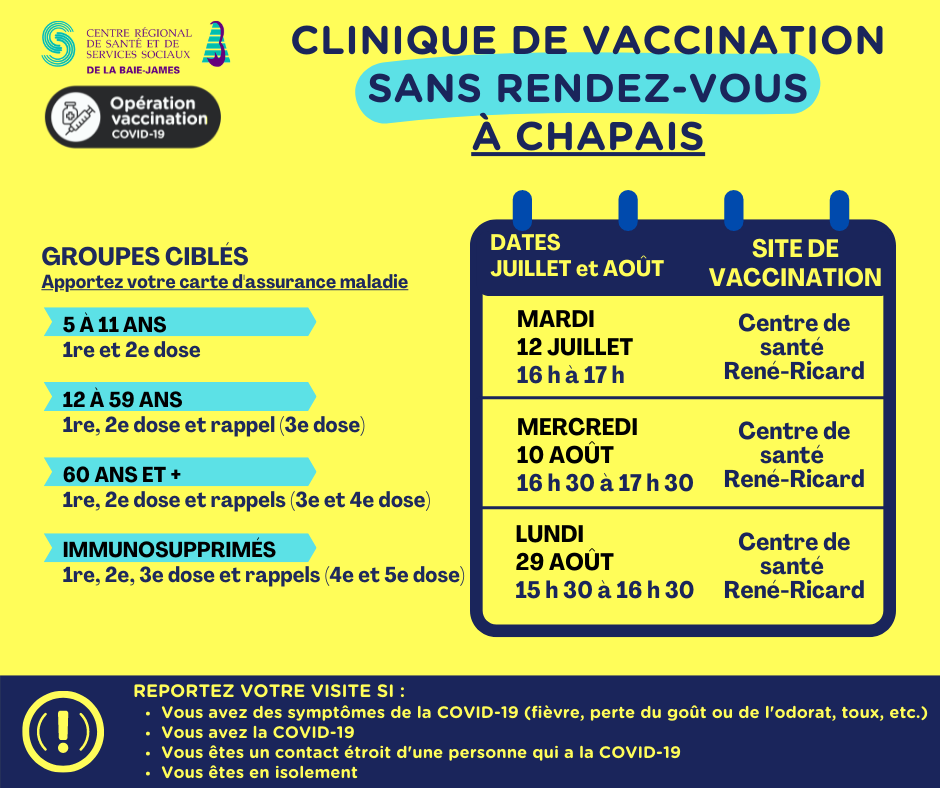 Voici les périodes prévues pour la vaccination sans rendez-vous par municipalité :